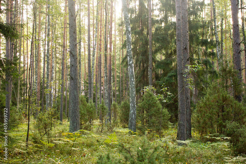 Obraz premium Forest trees illuminated by sunlight. Forest Glade.