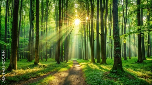 © suchetpong, Obraz premium Forest trees in sunlight with leading lines