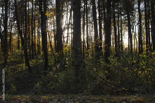 © Hany, Fototapeta premium Forest Trees Late Fall Autumn, with Golden Dry Leaves
