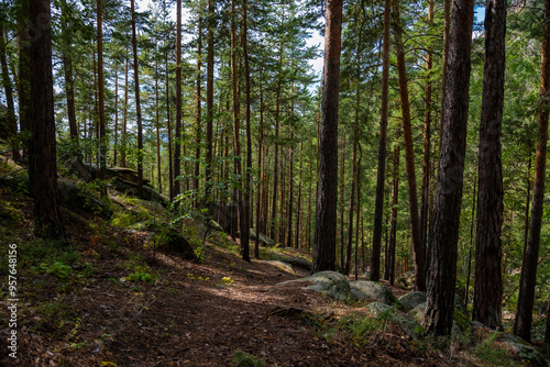 © Arina, Fototapeta premium Forest trees. Nature green wood sunlight backgrounds. Travel concept. High quality photo.