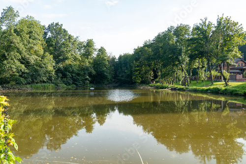 © Yevheniia, Fototapeta premium Forest trees reflected in calm lake water with green grass in foreground. Landscape nature photography. Summer season outdoor and eco tourism concept for design and print