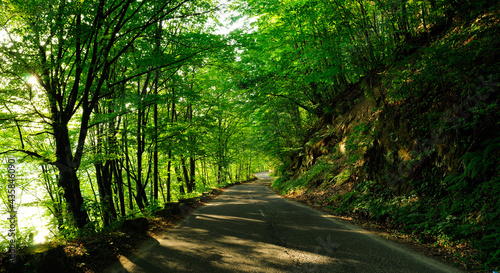 © Mihai, Fototapeta premium Forest trees with sunlight in the background creating long shadows on the ground