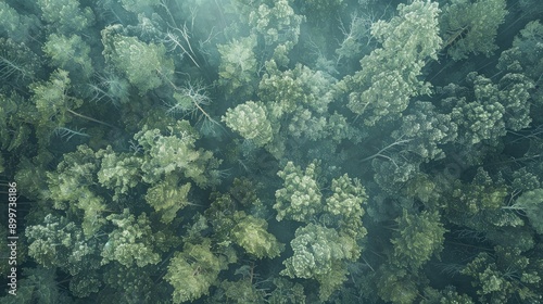 Fototapeta premium Forest treetop view in panoramic natural setting with day sunlight and mystical ambiance