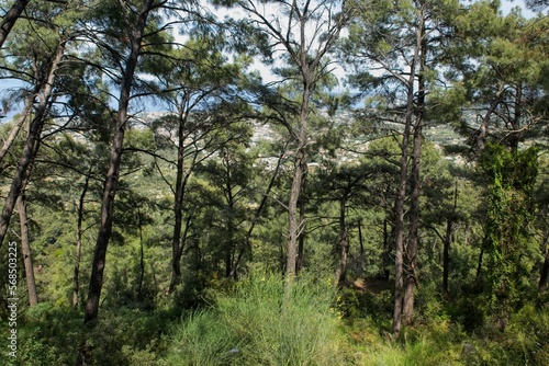 Fototapeta premium Forest view at Mount Filerimos in spring with trees and grass, Rhodes, Greece.