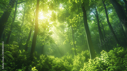 © AugusPic, Obraz premium Forest view in tall trees and sunrise