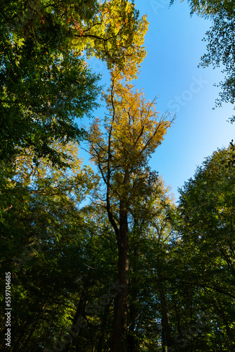 © senerdagasan, Obraz premium Forest view in vertical shot. Tall trees and clear sky