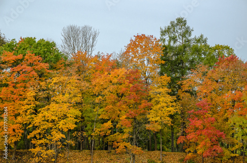 © vagrig, Fototapeta premium Forest wall of autumn trees on the high Bank playing with colored paints