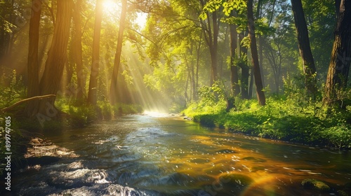 Obraz premium forest with a river flowing through, sunlight filtering through the trees