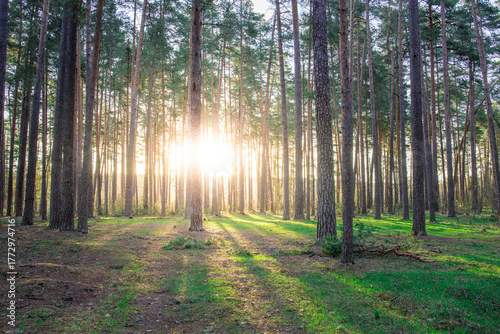 © Sergei, Obraz premium Forest with a sun shining through the trees