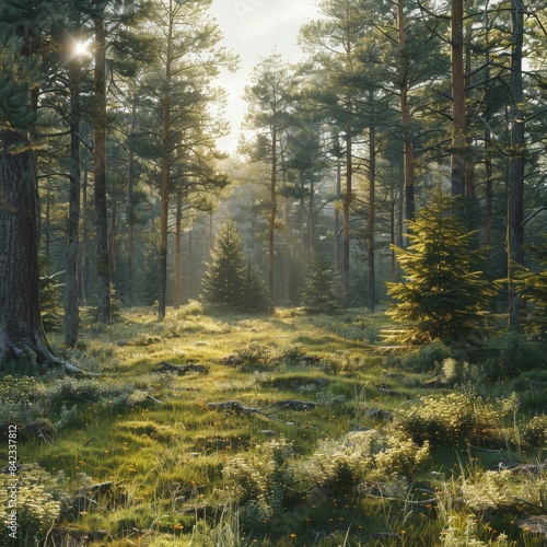 Obraz premium forest with a sun shining through the trees