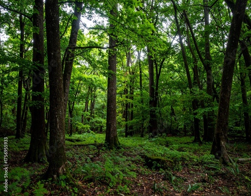 Fototapeta premium Forest with dense canopy blocking most light, creating a dark green interior with minimal ground vegetation