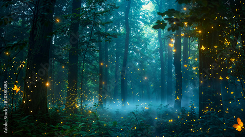 Fototapeta premium Forest with Fireflies at Night