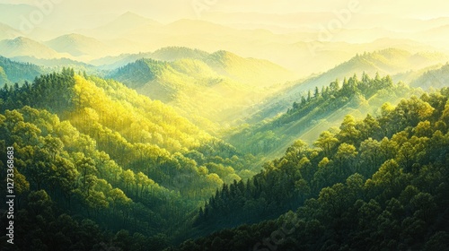 Fototapeta premium forest with layers of trees, stretching across rolling hills, with sunlight filtering through the canopy.