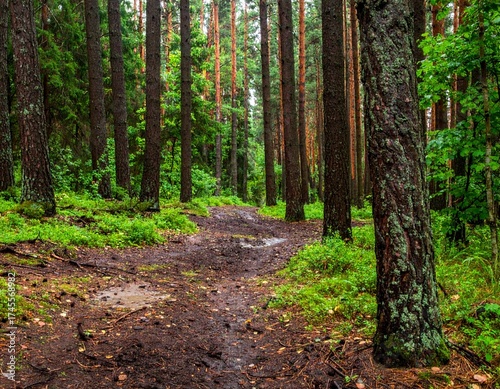 Naklejka premium Forest with patches of bare soil between tree trunks after recent light rain...