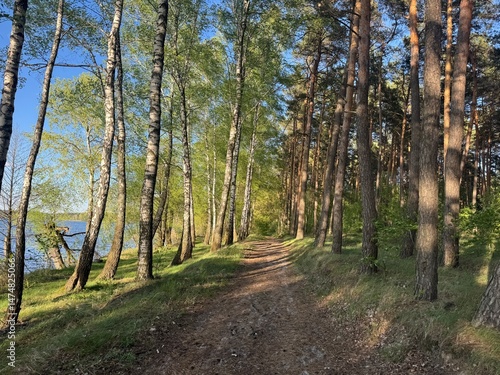 © Tania, Fototapeta premium forest with rows of pine trees rising among empty winding paths. Pine trees lined the paths in the forest.