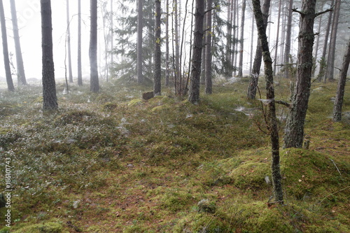 © Hans Baath, Fototapeta premium Forest with spider web a misty day