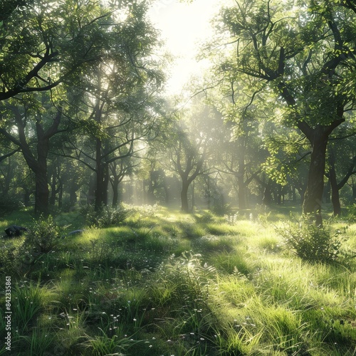 © LUPACO IMAGES, Fototapeta premium forest with sun shining through the trees and grass