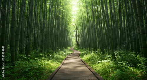 Obraz premium Forest with Sunlight Rays on Misty Path