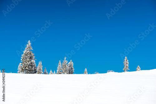 Naklejka premium Forest with winter pine trees in snow and blue sky