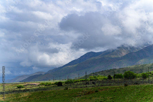 Fototapeta premium Forested mountains covered with low hanging clouds, USA