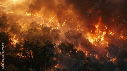 © indyntk, Naklejka premium Forests on fire, illustrating the impact of climate change, intense scene