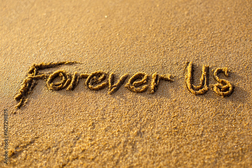 Fototapeta premium Forever Us Written in Golden Sand with Minimalist Hug Illustration and Gentle...
