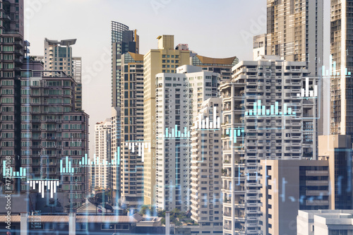 © VideoFlow, Obraz premium Forex and stock market chart hologram over panorama city view of Bangkok, the financial center in Southeast Asia. The concept of international trading. Double exposure.