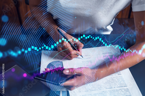 Fototapeta premium Forex chart drawing and a woman signing contract use phone. Multiexposure. Financial analysis concept.