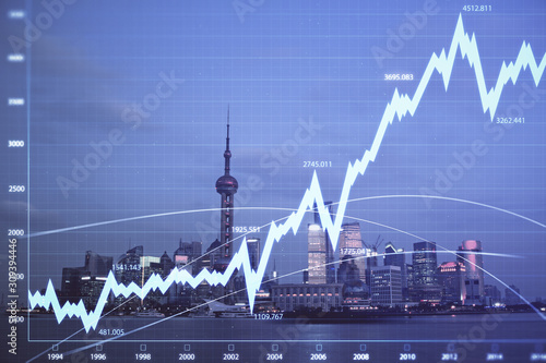 Obraz premium Forex chart on cityscape with tall buildings background multi exposure....