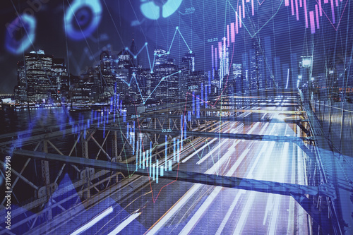 Obraz premium Forex chart on cityscape with tall buildings background multi exposure....