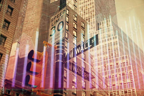 Naklejka premium Forex chart on cityscape with tall buildings background multi exposure....