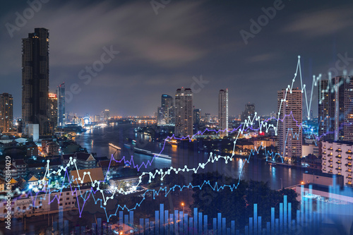 Fototapeta premium FOREX graph hologram, aerial night panoramic cityscape of Bangkok, the developed location for stock market researchers in Southeast Asia. The concept of fundamental analysis. Double exposure.