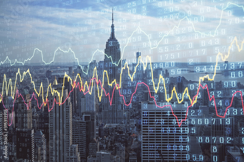 © peshkova, Fototapeta premium Forex graph on city view with skyscrapers background double exposure. Financial analysis concept.