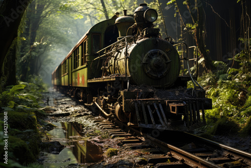 © Rainbow Kuma, Obraz premium Forgotten old and rusty orange locomotive in the jungle, ai generated.