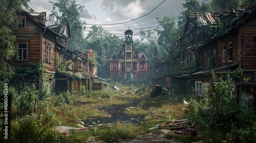 Naklejka premium Forgotten Town: Overgrown Houses and Decaying Streets