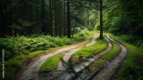 © QAISAR, Fototapeta premium Forked roads in green forest