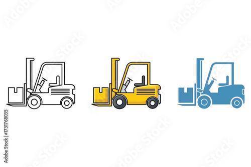 Fototapeta premium Forklift Icon Set – Three Stylized Illustrations in Black Outline, Yellow Industrial, and Blue Solid Variants – Minimal Vector Design for Construction, Warehouse, or Equipment Graphics