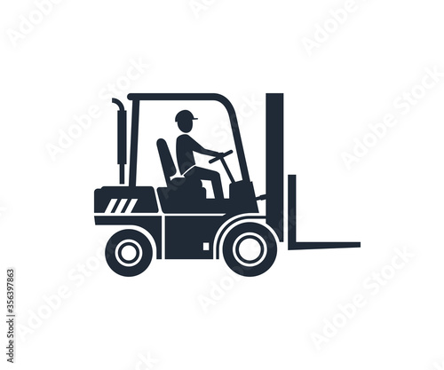 © Dmitry Kovalchuk, Fototapeta premium Forklift icon - warehouse packaging loader silhouette with driver - monochrome vector truck sign