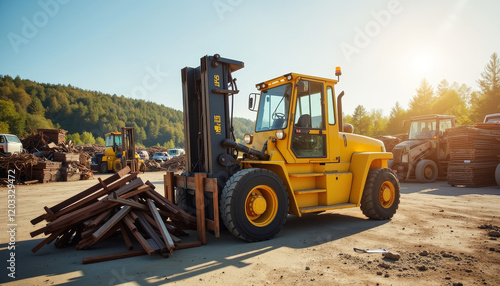 © Alex_Kalin, Obraz premium Forklift maneuvers slowly amidst lumber stacks at a rustic workshop under the golden afternoon sun