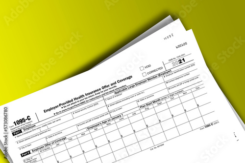 © dmitriy, Obraz premium Form 1095-C documentation published IRS USA 10.27.2021. American tax document on colored