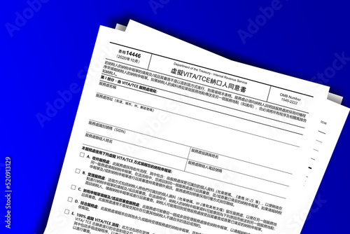 © dmitriy, Fototapeta premium Form 14446 (CN-T) documentation published IRS USA 44442. American tax document on colored