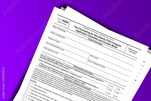 © dmitriy, Fototapeta premium Form 14204 documentation published IRS USA 03.14.2019. American tax document on colored