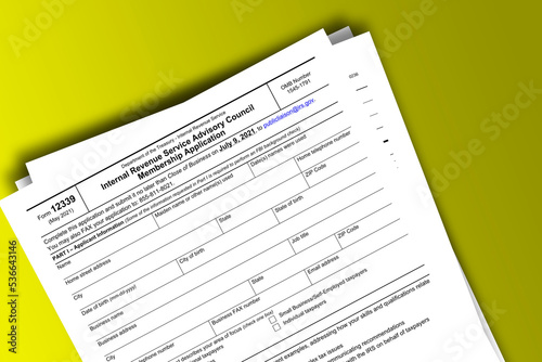 © dmitriy, Obraz premium Form 12339 documentation published IRS USA 05.25.2021. American tax document on colored