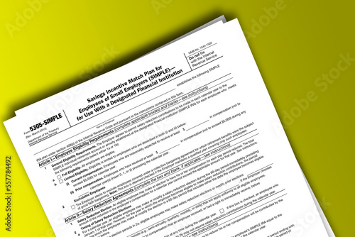 © dmitriy, Obraz premium Form 5305-SIMPLE documentation published IRS USA 41068. American tax document on colored