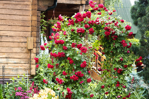 Fototapeta premium formal garden with red wattled rose on country house background