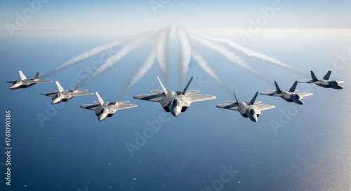 © Nazlykhan, Obraz premium Formation of military jets flying over ocean horizon on clear day
