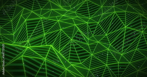 Fototapeta premium Forming abstract green wireframe mesh nodes in virtual network space, with luminous lines and dots
