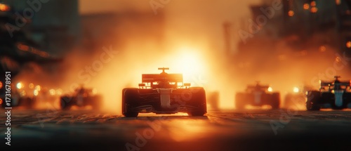 Obraz premium Formula 1 car at race start glowing in golden sunlight with dramatic dust and...