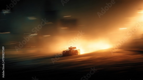© master1305, Naklejka premium Formula 1 car racing through fire and smoke under stadium lights. Concept of intense motorsport scene, dynamic speed, and extreme track environment.