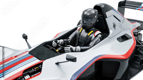 © Amelia Margaret, Fototapeta premium Formula 1 Race Car Driver In Cockpit Wearing Helmet And Racing Suit White Car With Red White And Blue Stripes Transparent Background High Detail Speed Competition Professional